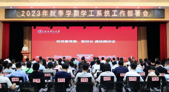 2023年秋季学期学工系统工作部署会在三江校区三实楼一楼多功能厅召开,校党委常委、副校长龚姚腾出席本次会议并讲话。保卫处、研工部、学工部、校团委、国际教育学院相关负责人,各学院(学部)分管学生工作负责人和全体专兼职辅导员参加会议。