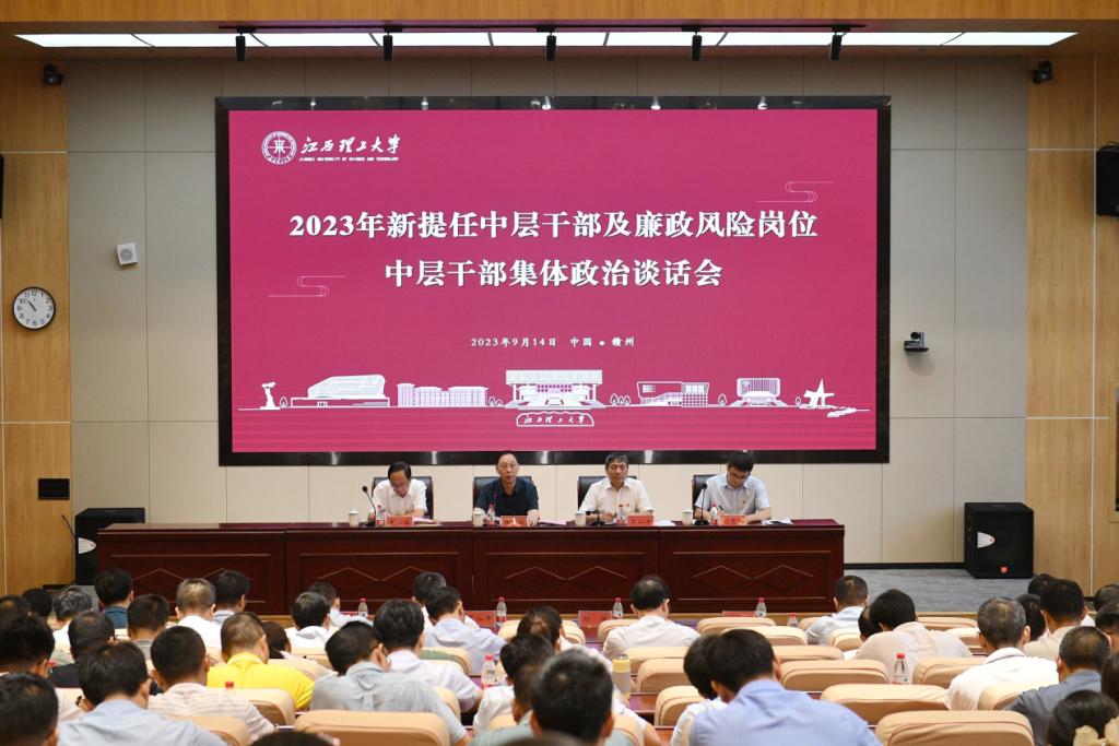 党委在三江校区启航会议中心1号报告厅对2023年新提任中层干部及廉政风险岗位中层干部开展集体政治谈话、廉政谈话及警示教育。