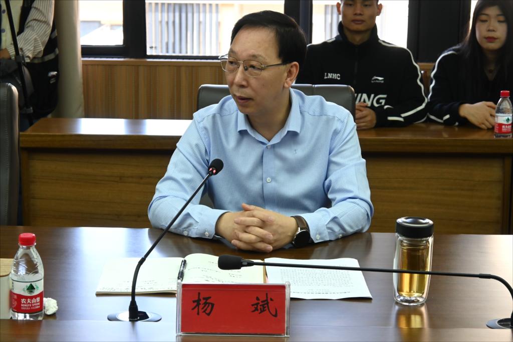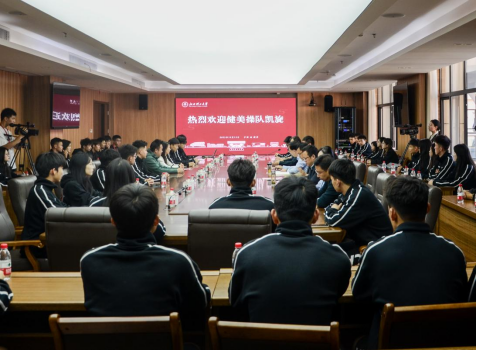 在三江校区濂溪楼2号会议室召开大学生健美操队座谈会,欢迎健美操队参加杭州亚运会开幕式和青运会比赛载誉归来。校党委书记杨斌出席会议,校党委常委、党委宣传部部长盛晓明,校党委常委、党委组织部部长刘志刚,党委(校长)办公室主任熊淑华,体育与艺术学院领导班子成员以及40余名健美操队教练、队员参加会议。会议由体育与艺术学院院长欧阳鹏飞主持。