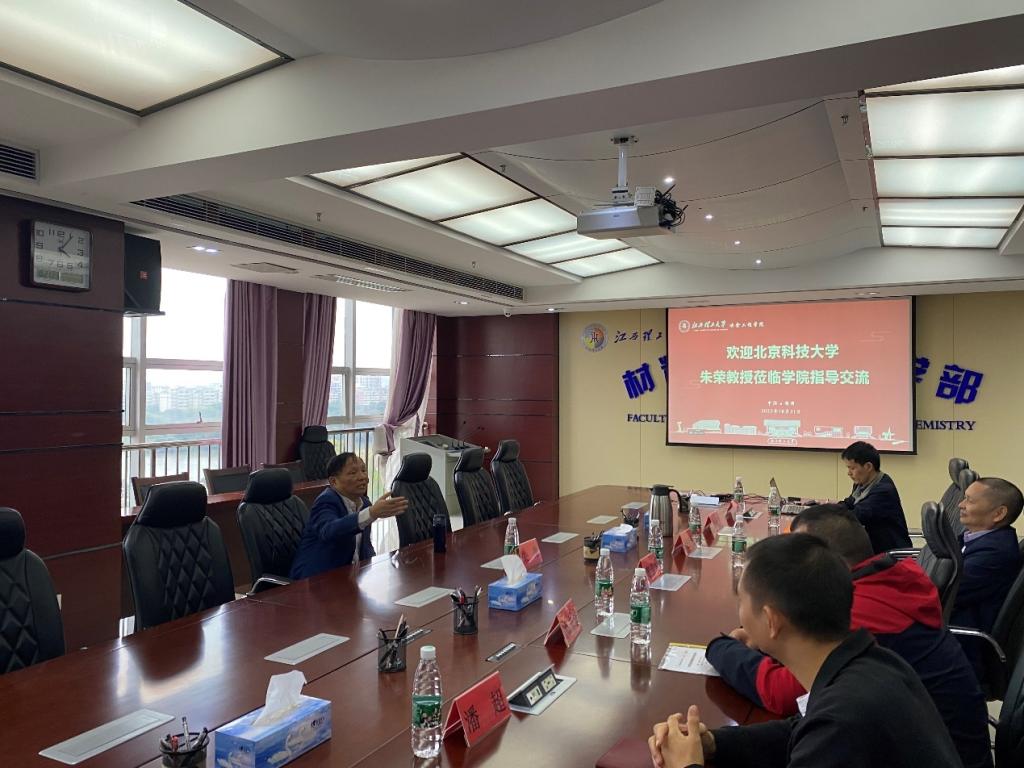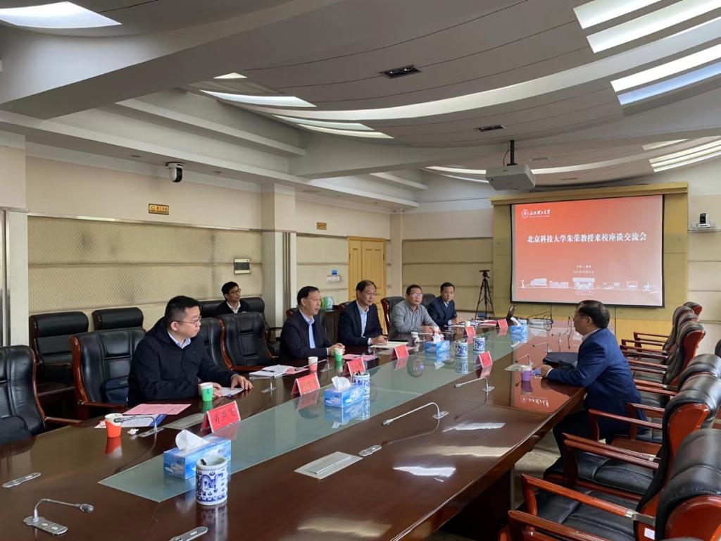 杨斌首先对朱荣教授重回母校指导学校学科建设,助力学校事业发展表示欢迎和感谢,他向朱荣教授介绍了学校近年来各项事业发展情况、取得的进步和冶金工程学科发展遇到的困境,希望朱荣教授能够传授经验,为学校的冶金工程学科建设工作厘清思路,明确方向,推动冶金工程学科向更高水平发展。