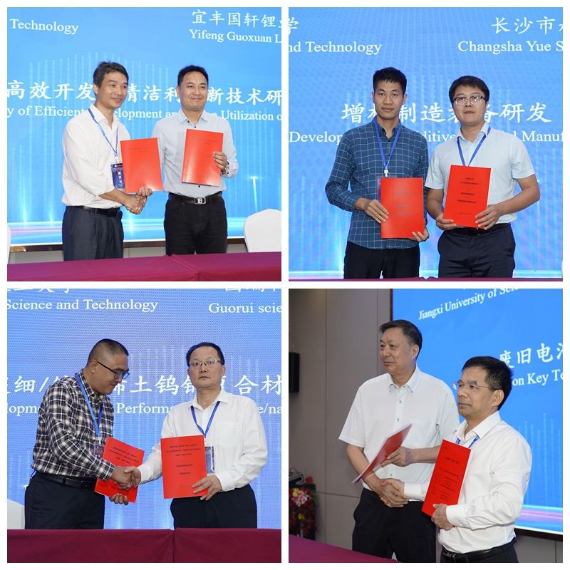 与宜丰国轩锂业有限公司、长沙市越深机械工程有限公司、国瑞科创稀土功能材料有限公司、江西睿达新能源科技有限公司举行产学研合作项目签约仪式。
