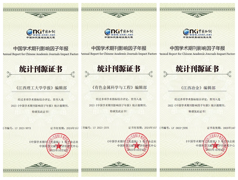 学报》《有色金属科学与工程》《江西冶金》继续入选2023《中国学术期刊影响因子年报》统计源期刊。