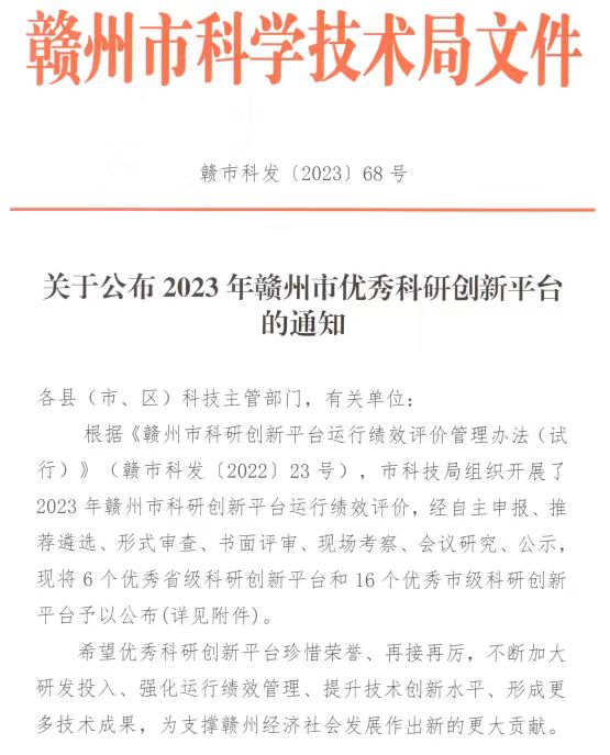 西瓜下载 两个科研平台在2023年赣州市科研创新平台运行绩效评价中获评优秀