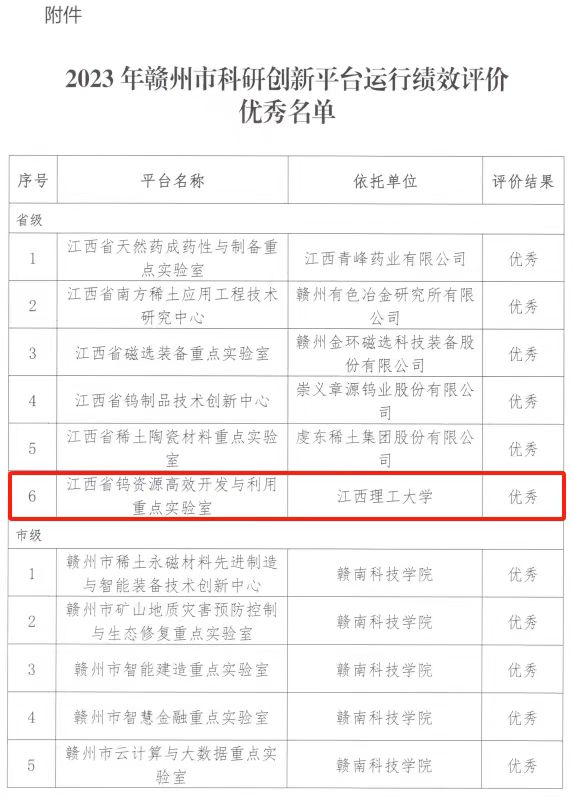 本网讯  近日,赣州市科学技术局公布了《关于2023年赣州市优秀科研创新平台的通知》(赣市科发〔2023〕68号),西瓜下载 “江西省钨资源高效开发与利用重点实验室”被评为省级优秀科研创新平台,“绿色冶金与过程强化工程技术研究中心”被评为市级优秀科研创新平台。