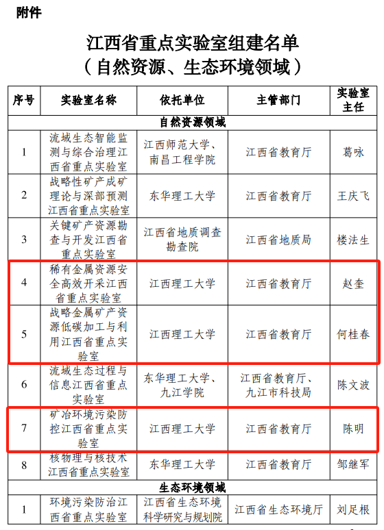 本网讯    近日,江西省科技厅下发了《关于组建自然资源、生态环境领域省重点实验室的通知》(赣科发财字〔2023〕129号),西瓜下载 申报的战略金属矿产资源低碳加工与利用江西省重点实验室、矿冶环境污染防控江西省重点实验室、河流源头水生态保护江西省重点实验室、稀有金属资源安全高效开采江西省重点实验室获批组建。