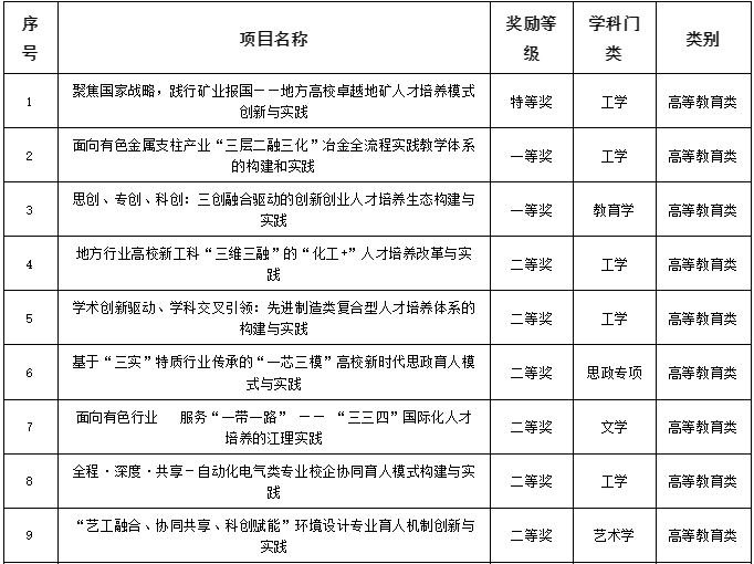 此次获奖名单中,高等教育类(本科层次)成果分别是由邱廷省教授负责的《聚焦国家战略,践行矿业报国——地方高校卓越地矿人才培养模式创新与实践》荣获特等奖;由温和瑞教授负责的《思创、专创、科创:三创融合驱动的创新创业人才培养生态构建与实践》、肖燕飞教授负责的《面向有色金属支柱产业“三层二融三化”冶金全流程实践教学体系的构建和实践》等2项成果荣获一等奖;由帅词俊、邓晓宇、李立清、龚姚腾、于仲安、刘玉宝等人负责的6项成果荣获二等奖。获奖成果分布在5个学科,其中工学5项,教育学1项,艺术学1项,文学1项,思政专项1项。