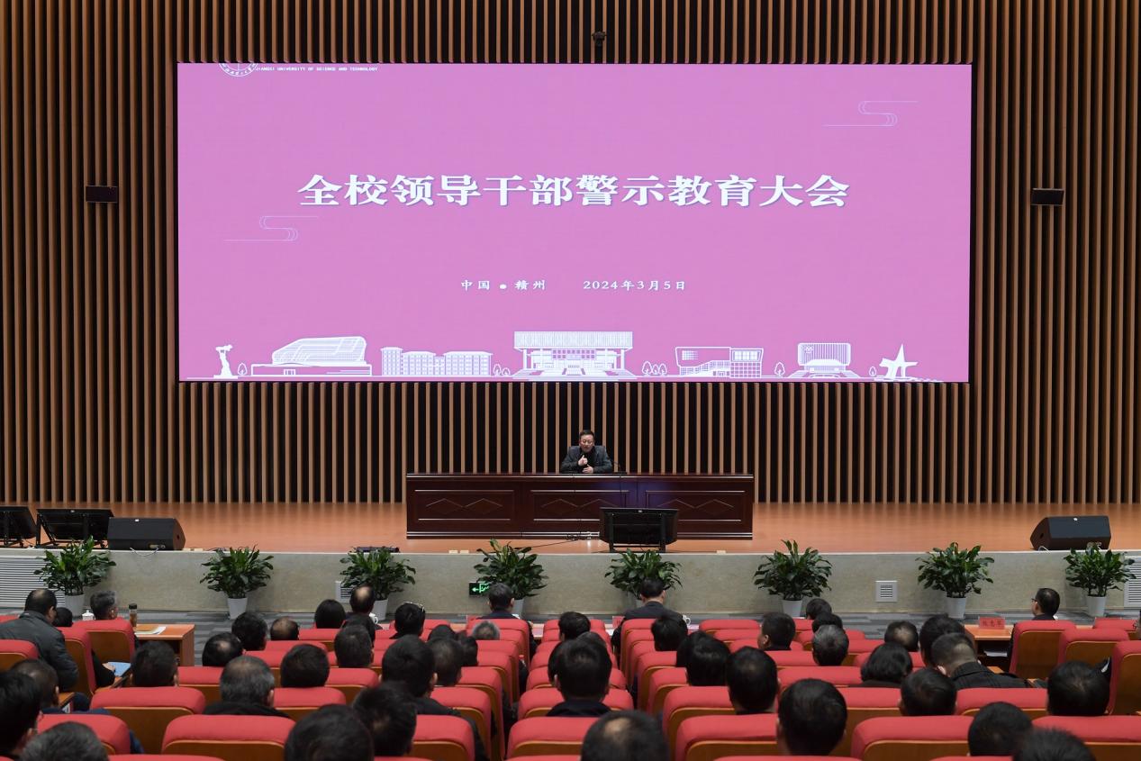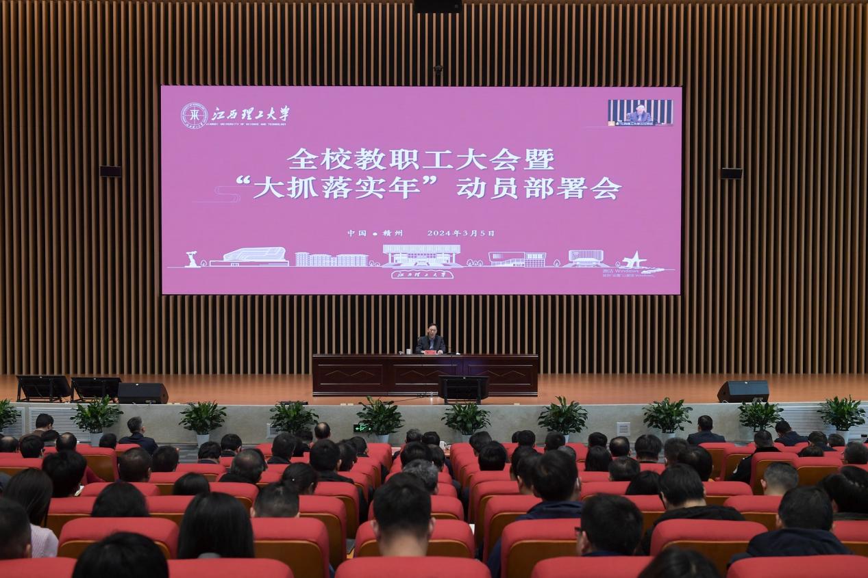 在三江校区志远会议中心1号会议厅召开全校教职工大会暨“大抓落实年”动员部署会,红旗校区、黄金校区、南昌校区、先进铜产业学院设分会场同步视频参会。全体在家校领导、党委常委出席会议,全校教职员工参加会议。会议由校党委书记杨斌主持并讲话。