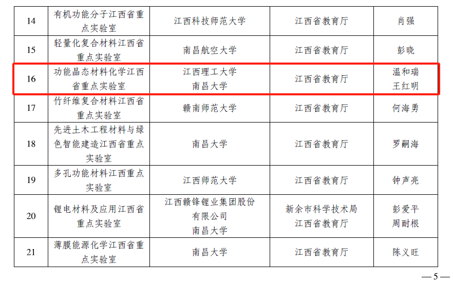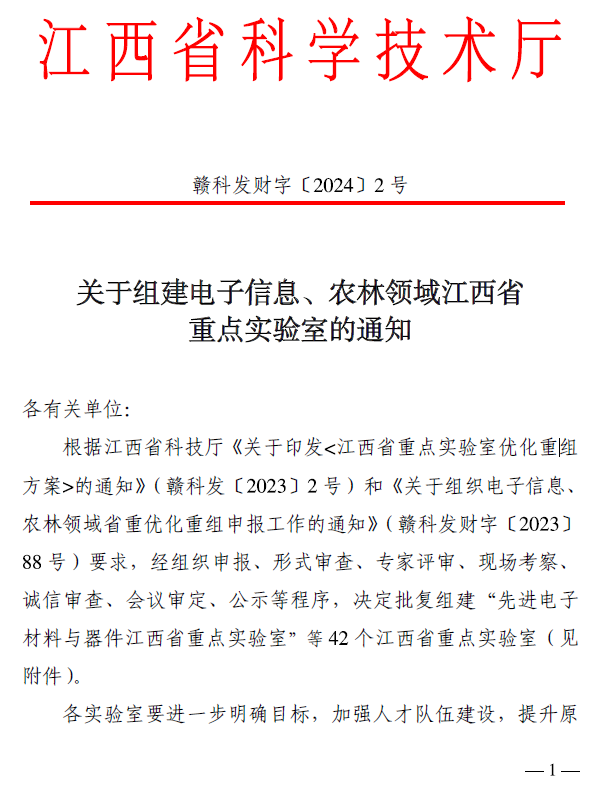 据悉,为构建特色鲜明、能力卓越的江西省重点实验室体系,支撑江西省经济社会高质量发展,省科技厅分批次对江西省重点实验室开展优化重组。经组织申报、形式审查、专家评审、现场考察、诚信审查、会议审定、公示等程序,电子信息、农林领域决定批复组建江西省重点实验室42个;材料、医疗卫生、生物医药领域决定批复组建江西省重点实验室72个。