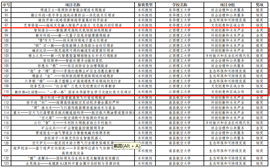 其中《智铜道合——新能源用高纯无氧铜极细线领航者》(推荐单位:先进铜产业学院)、《新材科技——新一代量子信息存储薄膜领航者》(推荐单位:化学化工学院)两个项目荣获金奖;《“墨”写天下——纳米级印刷电子墨水引领者》(推荐单位:国际创新研究院)、《“铒”目一新——高性能稀土改性铝合金的引领者》(推荐单位:材料科学与工程学院)、《磁启比伏——阻尼连续可调的磁流变减震器引领者》(推荐单位:机电工程学院)、《稀土之光——新一代智惠型富硒植物生长补光灯领航者》(推荐单位:稀土学院)、《“孢”含“稀”望——芽孢打造稀土矿区生态惠农新引擎》(推荐单位:资源与环境工程学院)等五个项目荣获银奖;《数切厨神——智能处理多功能切菜机和防患未“燃”》(推荐单位:应急管理与安全工程学院)、《防患未“燃”——社区消防安全治理领航者》(推荐单位:应急管理与安全工程学院)、《精益求“金”——铜阳极泥绿色提取领域的破题者》(推荐单位:冶金工程学院)、《只争朝“稀”——离子型稀土矿高效绿色开采领域的先行者》(推荐单位:土木与测绘工程学院)、《创享艺设——“红古绿”三色文化创意设计的革新者》(推荐单位:建筑与设计学院)、《新丝路•红语情——“一带一路”国家来华留学生学习交流红色文化项目》(推荐单位:外国语学院)等六个项目荣获铜奖。