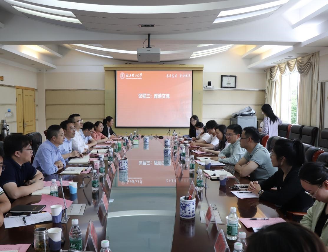 在红旗校区原行政楼第二会议室,刘飞一行与师生代表进行了座谈。马克思主义学院院长邓显超就学院思政课建设的工作进展与成效、存在的不足以及下一步努力的方向进行了汇报。