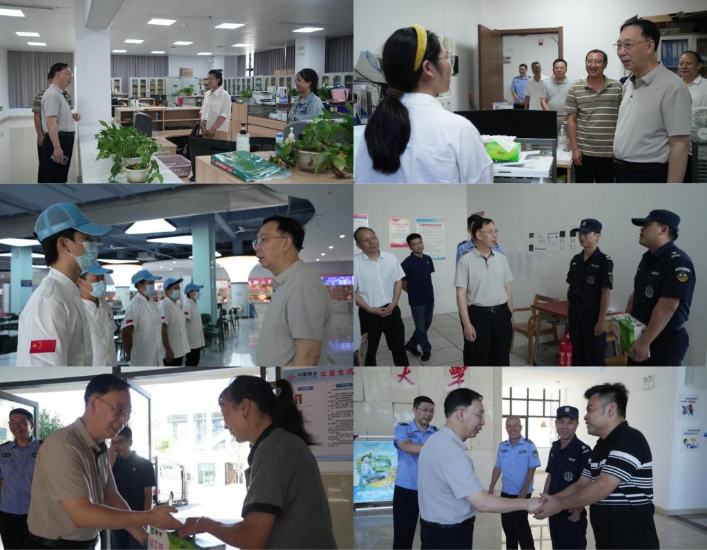 本网讯  炎阳送夏意,关怀润心田。8月7日上午,校党委书记杨斌,校党委常委、副校长唐云志等校领导,在相关部门负责人的陪同下,分别前往三江校区、红旗校区的暑期值班室、科研实验室、后勤服务部、安保巡逻点、开放食堂、校医务室、校车队、二期建设工地等地,走访慰问暑期期间仍然坚守工作岗位的教职员工,为他们带去夏日的清凉与诚挚的问候。