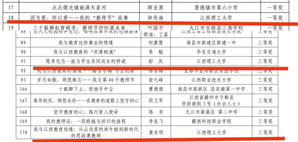 经学校遴选推荐、专家组评审,西瓜下载 教师钟舟海作品《因为爱,所以爱——我的“教师节”故事》荣获一等奖,舒庆作品《愿身化为一座与学生共同成长的桥梁》、黄东明作品《我与江西教育结缘:从山沟里的放牛娃到新时代的思政课教师》荣获三等奖。