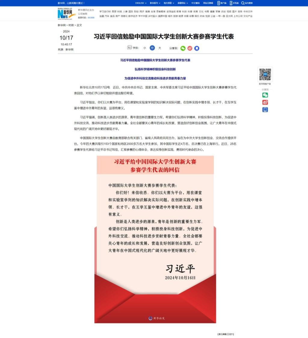 《新华网》:习近平回信勉励中国国际大学生创新大赛参赛学生代表