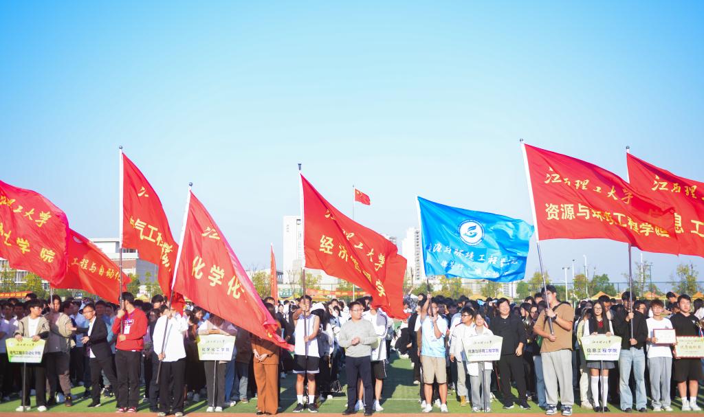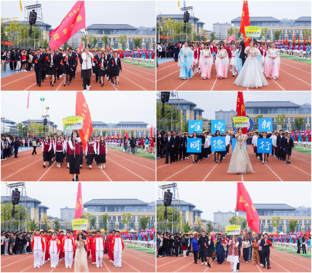 伴随着激昂的音乐,国旗队、校徽队、校旗队、彩旗队以沉稳的步伐和整齐的队形引领入场,各学院、部门代表队依次出场,他们步伐整齐,身姿矫健;场上彩旗飘飘,方队井然。