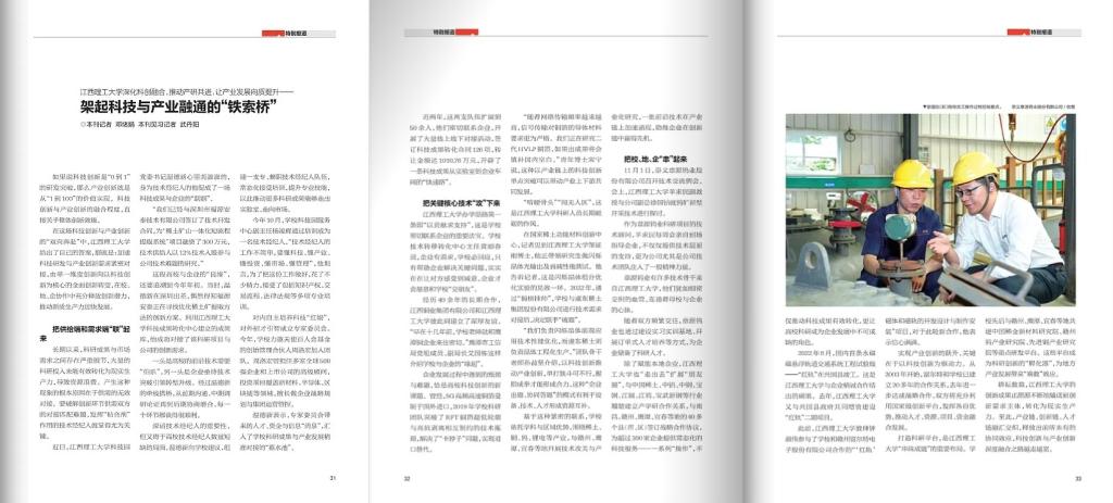 也“走出去”扩展“朋友圈”,与中国稀土、中铝、中钢、宝钢、江铜、江钨、宝武新钢等行业翘楚建立产学研合作关系,与南昌、鹰潭、宜春等地的40多个县(市、区)签订战略合作协议,为超过300家企业提供常态化的科技服务……一系列“操作”,不仅推动科技成果有效转化,更让高校科研成为企业发展中不可或缺的角色。