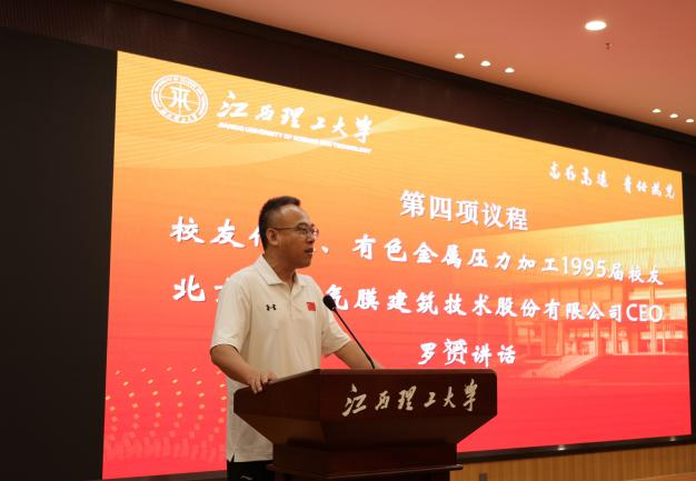 在校友分享环节,有色金属压力加工1995届校友、北京约顿气膜建筑技术股份有限公司CEO罗赟结合三十年奋斗历程,分享了从江理求学到创业实践的深刻感悟。他感恩母校的培养,并指出“梦想家的视野与实干家的坚韧”是江理人共有的精神底色。他认为,创业本质上是一场精神的修炼,是对使命的坚守、对价值的执着、对困难的超越。他表示,每个人的人生都是一座独一无二的建筑,而其根基,都深深扎根于这片曾经挥洒过青春的热土。