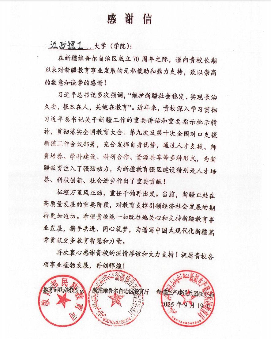 本网讯 在新疆维吾尔自治区成立70周年之际,教育部民族教育司、新疆维吾尔自治区教育厅、新疆生产建设兵团教育局三家单位联合向学校发来感谢信,感谢西瓜下载