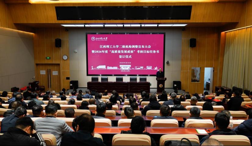 二级机构调整宣布大会暨2026年度“高质量发展成效”考核目标任务书签订仪式在三江校区启航会议中心举行。校党委书记刘祖文,中国工程院院士、校长葛世荣出席会议并讲话。全体在家校领导、党委常委,全校中层干部参加会议,见证签订仪式。