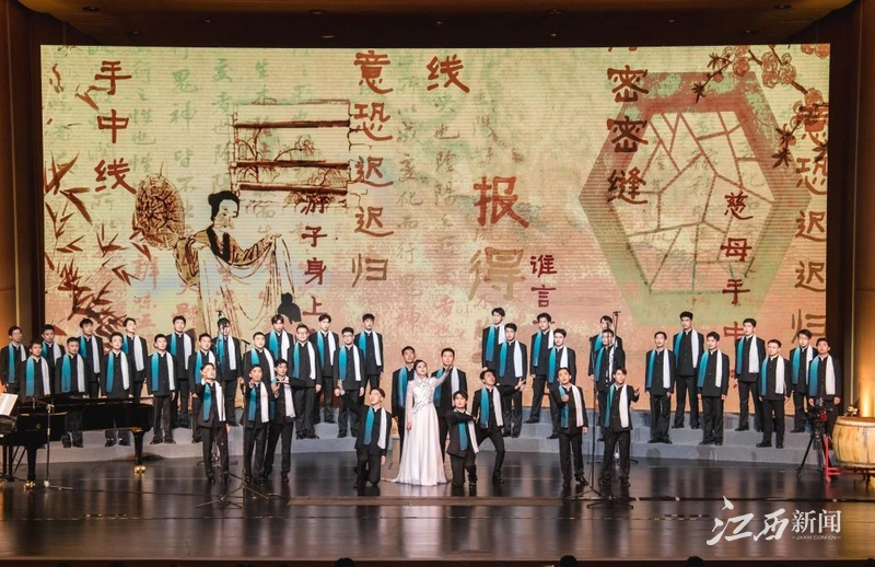 本场音乐会以混声合唱、男声合唱、女声合唱、领唱与合唱、小合唱等多种形式传唱古诗词,并将诗歌朗诵、器乐演奏、情景表演等多种艺术形式有机地串编在一起,还“诗乐一体、歌诗同源”。“‘天门中断楚江开’的歌声加上铿锵有力的鼓声,我仿佛看到了诗仙李白带着我在长江乘舟驰骋,一览大唐风采,感谢歌声赋予诗歌具体的形象。”赣州市章贡区第二小学音乐教师刘璐彬表示。