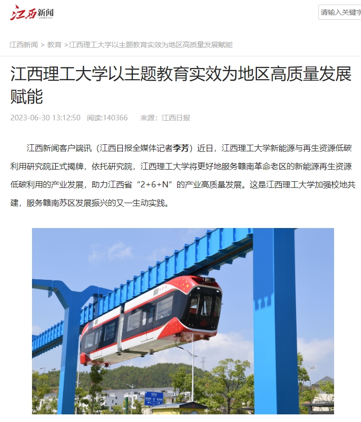 学校充分利用自身在稀土领域人才培养和科学研究方面具有的区位、学科和人才优势,加快促进科技创新成果转化为现实生产力,推动科研成果走出校门、走向市场。例如,在牵头研制的世界首条永磁磁浮轨道交通系统“红轨”工程试验线顺利竣工的基础上,持续加强与相关政府部门、企业、科研院所的对接合作,大力推动“红轨”项目优先在赣州落地。与赣州经开区签订战略合作框架协议,积极推动人才共育、科研共创、资源共享,促进教育链、人才链与产业链、创新链有机衔接;与和君职业学院、国家稀土功能材料创新中心、赣县区政府共建中国稀金谷稀金产业学院,实现供需精准对接、校地企互联共赢发展;与大余县共建赣州市钨产业技术研究院,把新型研发平台建在产业链上,实现“零距离”服务,近段时间以来,学校强化校县交流合作,把产学研用的“触角”不断向基层延伸。