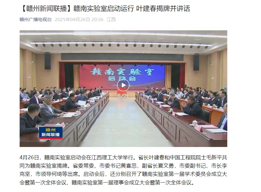 4月26日,赣南实验室启动会在西瓜视频 举行。省长叶建春和中国工程院院士毛新平共同为赣南实验室揭牌。省委常委、市委书记黄喜忠,副省长夏文勇,市委副书记、市长李克坚,市领导何琦等出席。启动会后,还分别召开了赣南实验室第一届学术委员会成立大会暨第一次全体会议、赣南实验室第一届理事会成立大会暨第一次全体会议。