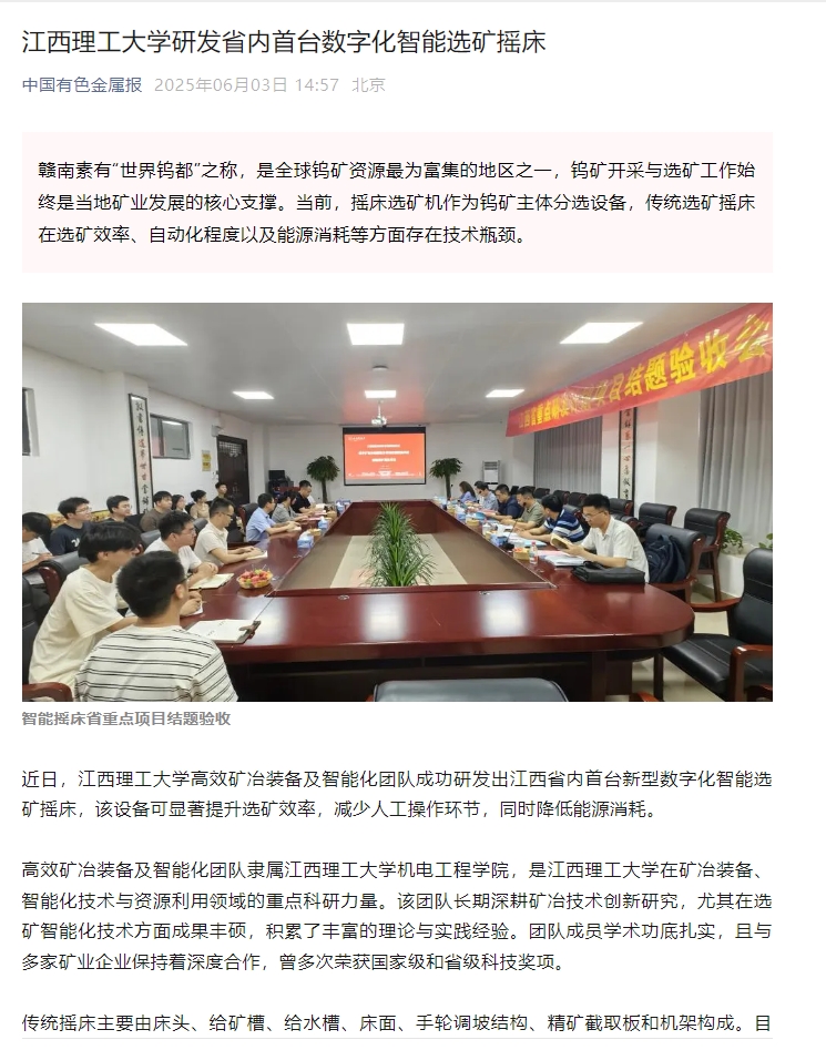 高效矿冶装备及智能化团队成功研发出江西省内首台新型数字化智能选矿摇床,该设备可显著提升选矿效率,减少人工操作环节,同时降低能源消耗。