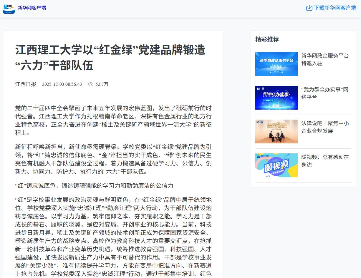 “红”是学校事业发展的政治灵魂与鲜明底色,在“红金绿”品牌中居于统领地位。学校党委深入实施“忠诚江理”“勤廉江理”两大行动,为干部队伍建设熔铸忠诚底色。以学习力为基,筑牢信仰之本、夯实履职之能。学习力是干部成长的基石、履职的羽翼,是应对变局、开创事业的核心能力。当前,科技进步日新月异,稀土及关键矿产领域的技术创新正成为保障国家资源安全、塑造新质生产力的战略支点。高校作为教育科技人才的重要交汇点,在抢抓新一轮科技革命和产业变革历史机遇,统筹推进教育强国、科技强国、人才强国建设,加快发展新质生产力中具有不可替代的作用。干部是学校事业发展的“关键少数”,唯有持续提升学习力,方能在变局中把准方向、在新赛道上抢占先机。学校党委深入实施“忠诚江理”行动,通过干部集中培训、红色研学、专题研讨等务实举措,切实培育干部绝对忠诚的政治品格、坚如磐石的理想信念、履职尽责的过硬本领。