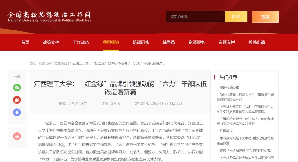 作为扎根赣南革命老区、深耕有色金属行业的地方行业特色高校,正全力奋进在创建“稀土及关键矿产领域世界一流大学”的新征程上。新征程呼唤新担当,新使命亟需硬脊梁。学校党委以“红金绿”党建品牌为引领,将“红”铸忠诚的信仰底色、“金”淬担当的实干成色、“绿”创未来的民生亮色有机融入干部队伍建设全过程,着力锻造具备过硬学习力、公信力、创新力、协同力、防护力、执行力的“六力”干部队伍,为学校事业高质量发展提供坚强组织保障和坚实人才支撑。