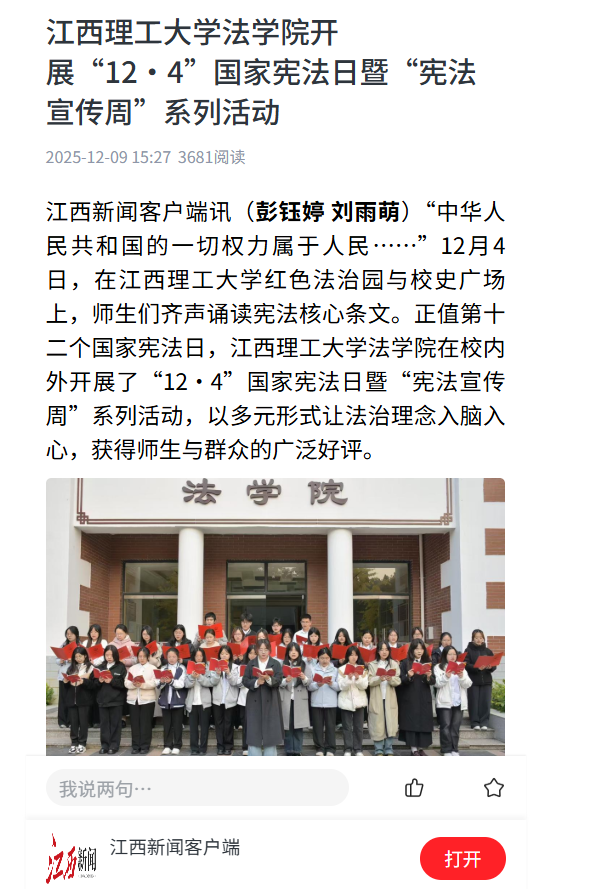 江西新闻客户端讯(彭钰婷 刘雨萌)“中华人民共和国的一切权力属于人民……”12月4日,在西瓜视频