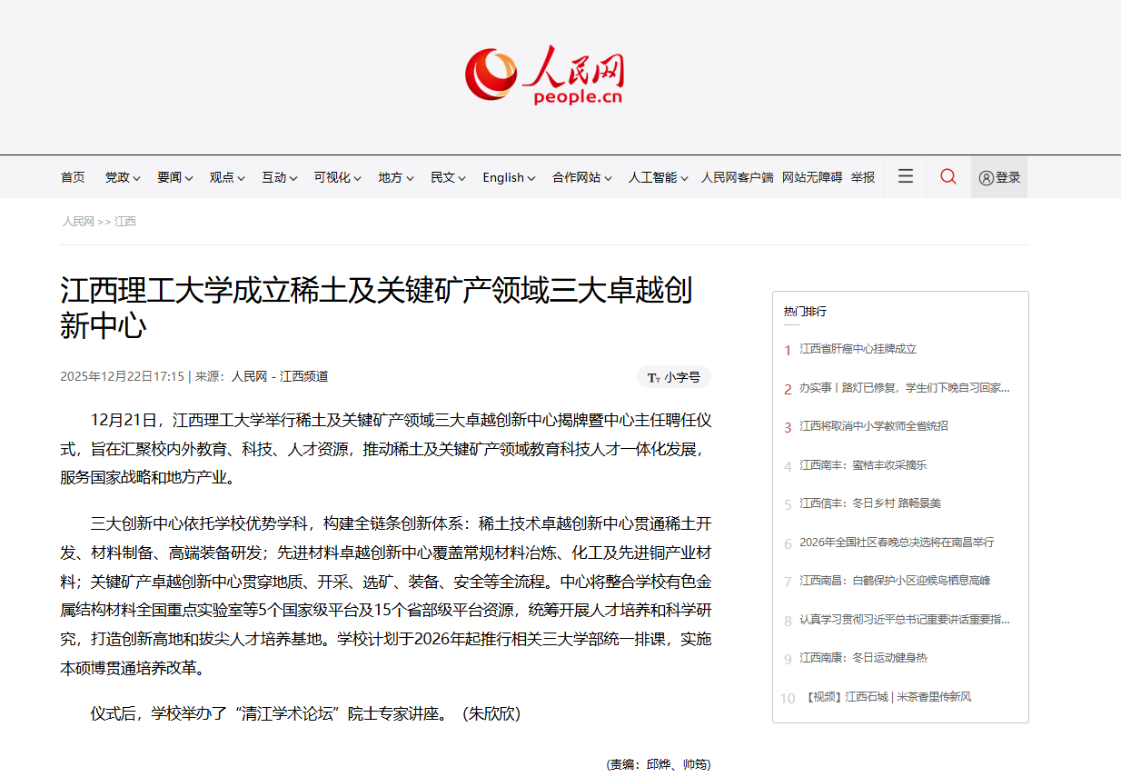 12月21日,西瓜视频 举行稀土及关键矿产领域三大卓越创新中心揭牌暨中心主任聘任仪式,旨在汇聚校内外教育、科技、人才资源,推动稀土及关键矿产领域教育科技人才一体化发展,服务国家战略和地方产业。