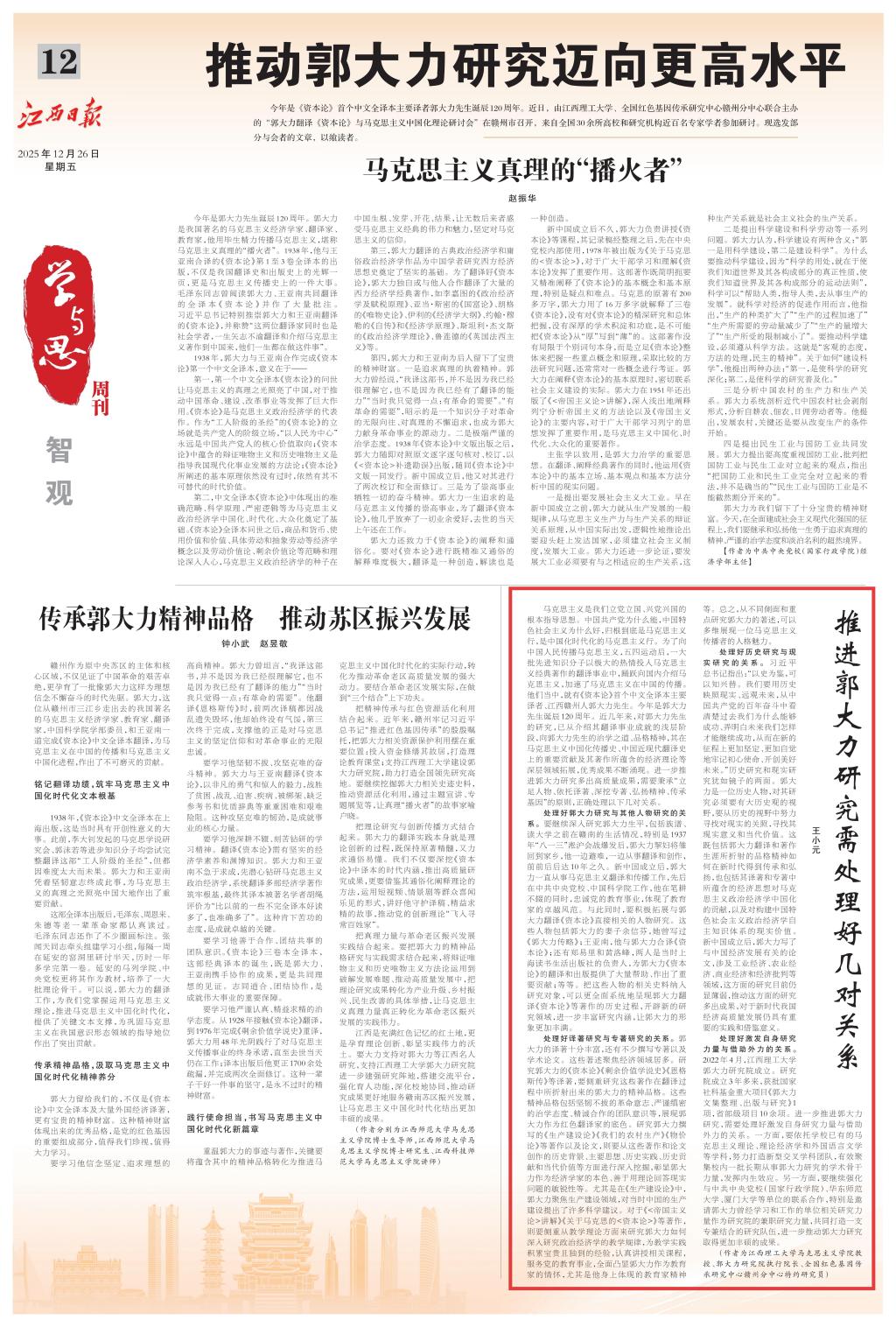 马克思主义是我们立党立国、兴党兴国的根本指导思想。中国共产党为什么能,中国特色社会主义为什么好,归根到底是马克思主义行,是中国化时代化的马克思主义行。为了向中国人民传播马克思主义,五四运动后,一大批先进知识分子以极大的热情投入马克思主义经典著作的翻译事业中,踊跃向国内介绍马克思主义,加速了马克思主义在中国的传播。他们当中,就有《资本论》首个中文全译本主要译者、江西赣州人郭大力先生。今年是郭大力先生诞辰120周年。近几年来,对郭大力先生的研究,已从介绍其翻译事业成就的浅层阶段,向郭大力先生的治学之道、品格精神,其在马克思主义中国化传播史、中国近现代翻译史上的重要贡献及其著作所蕴含的经济理论等深层领域拓展,优秀成果不断涌现。进一步推进郭大力研究多出高质量成果,需要秉承“立足人物、依托译著、深挖专著、弘扬精神、传承基因”的原则,正确处理以下几对关系。