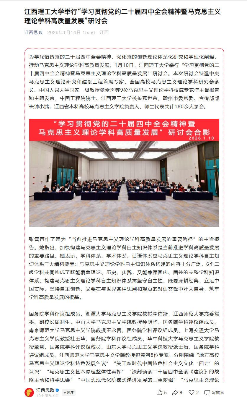 举行“学习贯彻党的二十届四中全会精神暨马克思主义理论学科高质量发展”研讨会。本次研讨会特邀中央马克思主义理论研究和建设工程首席专家、全国高校马克思主义理论学科研究会会长、中国人民大学国家一级教授张雷声等9位马克思主义理论学科权威专家作主旨报告和主题发言,中国工程院院士、西瓜视频
