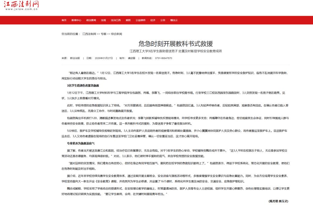 “面对这样的突发情况,我们难免也有些担心,但好在身边有同学相互鼓气,顺利把在校学到的急救知识都用上了。”包超然表示,得益于学校系统化、常态化开展的安全教育,使他们在危急时刻能及时出手相助。