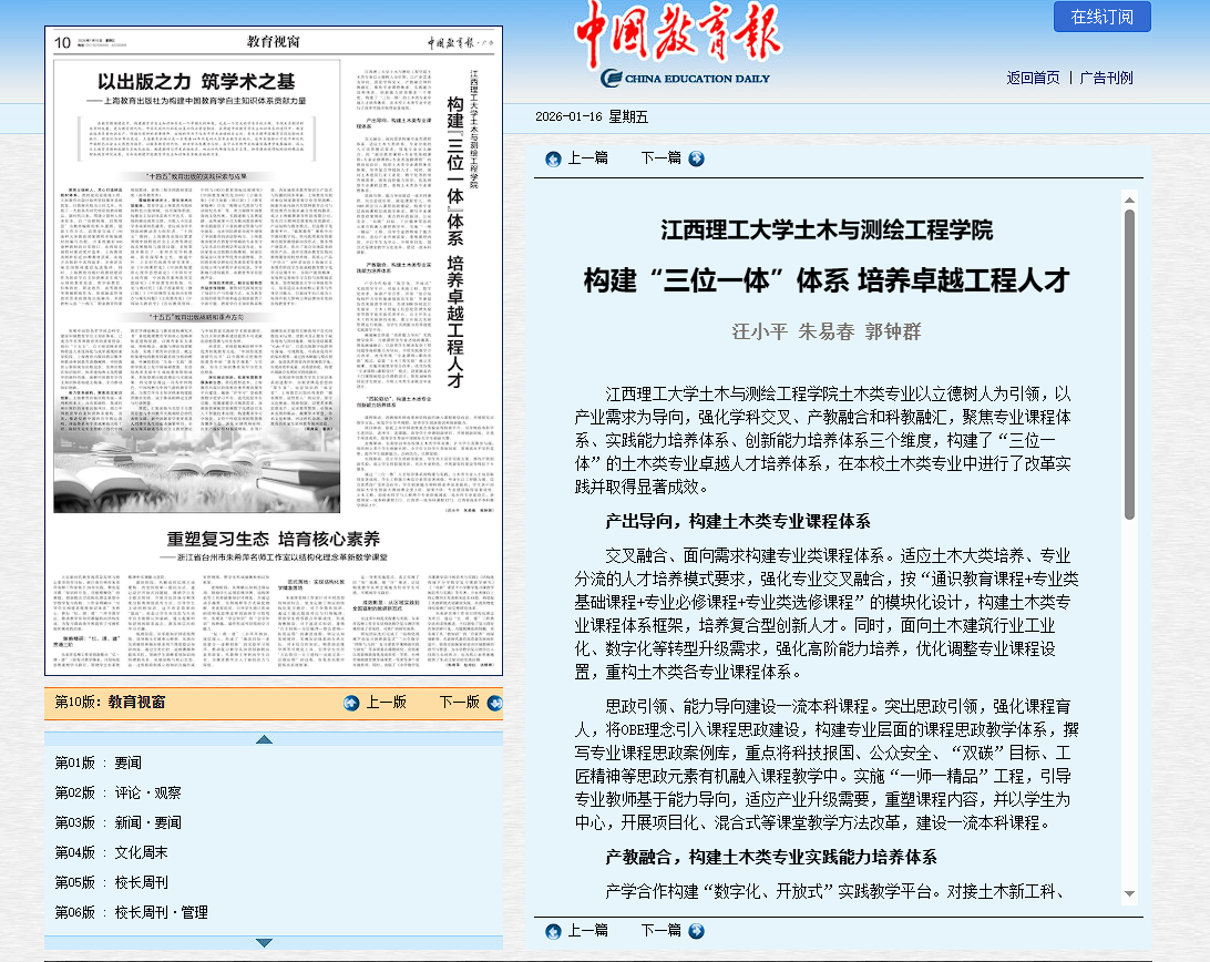 土木与测绘工程学院土木类专业以立德树人为引领,以产业需求为导向,强化学科交叉、产教融合和科教融汇,聚焦专业课程体系、实践能力培养体系、创新能力培养体系三个维度,构建了“三位一体”的土木类专业卓越人才培养体系,在本校土木类专业中进行了改革实践并取得显著成效。