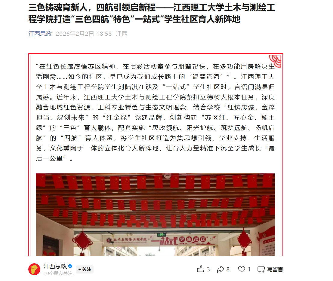 土木与测绘工程学院紧扣立德树人根本任务,深度融合地域红色资源、工科专业特色与生态文明理念,结合学校“红铸忠诚、金粹担当、绿创未来”的“红金绿”党建品牌,创新构建“苏区红、匠心金、稀土绿”的“三色”育人载体,配套实施“思政领航、阳光护航、筑梦远航、扬帆启航”的“四航”育人体系,将学生社区打造为集思想引领、学业支持、生活服务、文化熏陶于一体的立体化育人新阵地,让育人力量精准下沉至学生成长“最后一公里”。