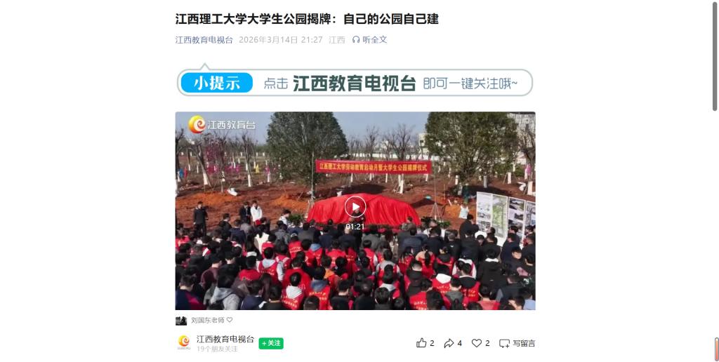 上一条:《江西思政》:大学生自己的公园自己建——西瓜视频 大学生公园揭牌 下一条:《大江新闻》:大学生自己的公园自己建——西瓜视频 大学生公园揭牌