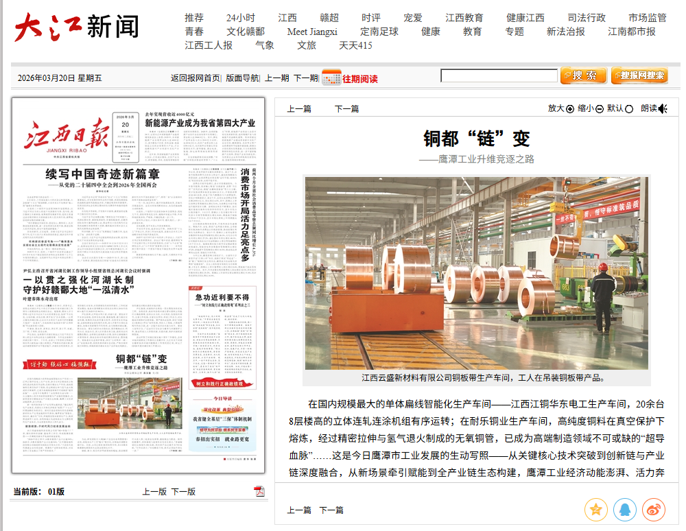 从洞察风口精准入局,到主动融合汇聚资源,再到联动共生开拓新局,鹰潭以清晰的“链”变路径,书写着传统工业城市向现代化产业体系迈进的新篇章。这不仅是铜产业的涅槃升级,更是一座城市在发展理念、路径与能级上的全面升维竞逐。