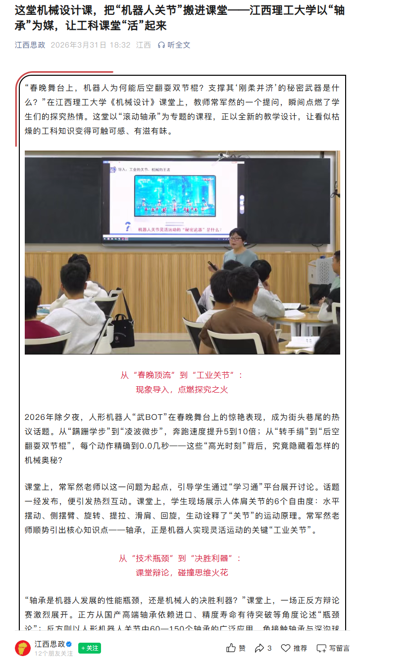 《机械设计》课堂上,教师常军然的一个提问,瞬间点燃了学生们的探究热情。这堂以“滚动轴承”为专题的课程,正以全新的教学设计,让看似枯燥的工科知识变得可触可感、有滋有味。