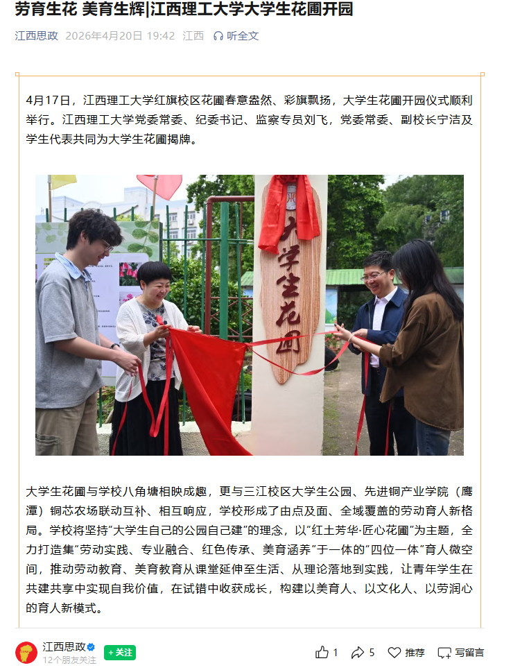 大学生花圃与学校八角塘相映成趣,更与三江校区大学生公园、先进铜产业学院(鹰潭)铜芯农场联动互补、相互响应,学校形成了由点及面、全域覆盖的劳动育人新格局。学校将坚持“大学生自己的公园自己建”的理念,以“红土芳华·匠心花圃”为主题,全力打造集“劳动实践、专业融合、红色传承、美育涵养”于一体的“四位一体”育人微空间,推动劳动教育、美育教育从课堂延伸至生活、从理论落地到实践,让青年学生在共建共享中实现自我价值,在试错中收获成长,构建以美育人、以文化人、以劳润心的育人新模式。