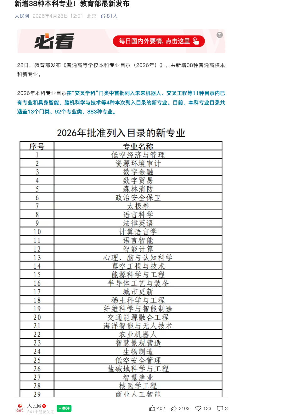 《人民网》:新增38种本科专业!教育部最新发布