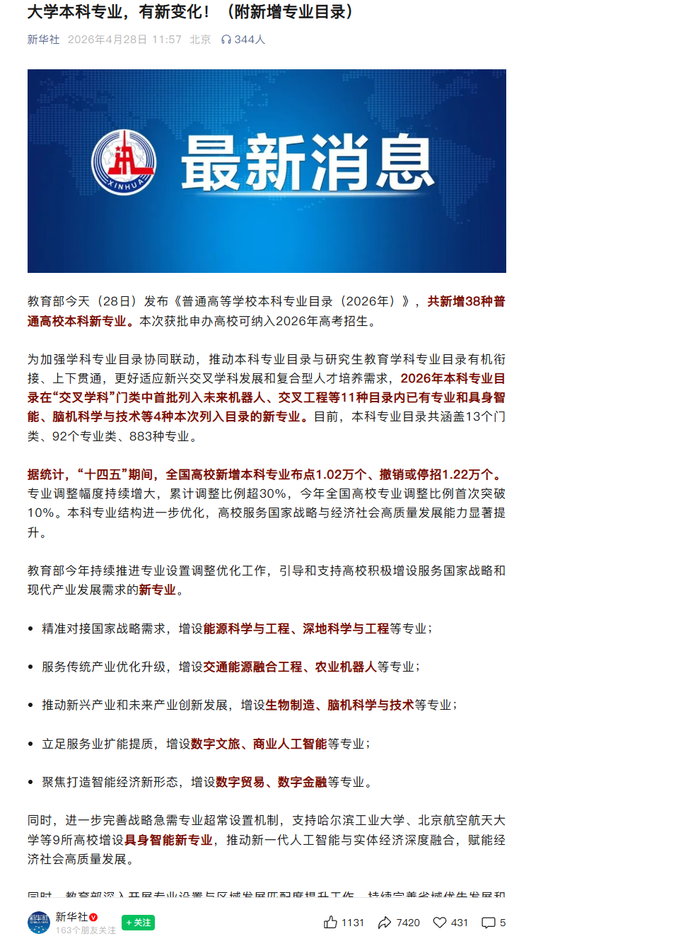 《新华社》:大学本科专业,有新变化!(附新增专业目录)