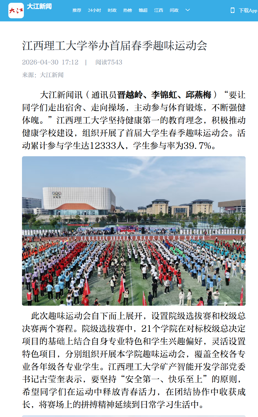 学生体质健康提升专项行动实施方案(2026年—2030年)》,用同学们喜闻乐见的方式推进学生体质健康提升,让同学们学在江理、乐在江理、成在江理。