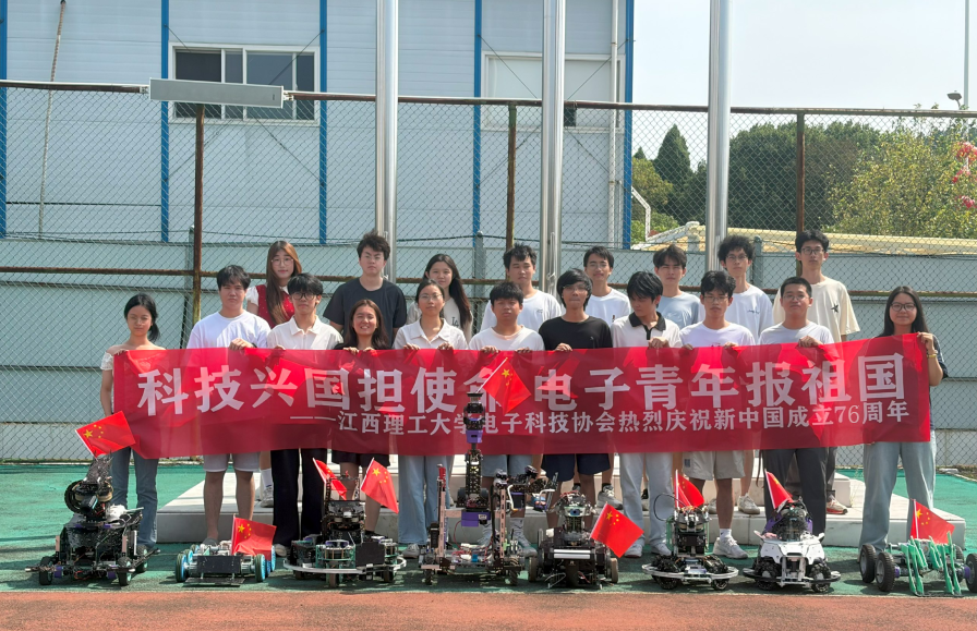 电子科技协会组成的ROBOMASTER机器人方阵静列一旁,以一场“静默的致敬”为祖国母亲献上江理学子的科技贺礼。