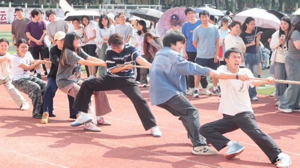 随着裁判一声令下,各项趣味赛事有序展开。在同炉共进项目中,队员们脚踝相绑、手臂相挽,齐声喊着“一二、一二”的口号并肩前行。步伐整齐划一,节奏稳定有力,队员们相互鼓励,50米的赛道上,每一步都踏出了团结的节拍,用行动诠释了“人心齐,泰山移”的深刻内涵;钨金战鼓项目中,队员们围鼓而立、紧握长绳,凝神聚力控制鼓面平稳,小小鼓面之上,跳动的不仅是排球,更是同心协力、配合无间的团队信念;金石投趣现场欢乐不断,趣味十足。投掷手瞄准目标、奋力抛投,背篓手灵活移动、精准接球,排球在空中划出一道道轻快弧线;矿脉齐跃项目将赛场气氛推向高潮。长绳在空中翻飞盘旋,摇绳同学节奏稳定,参赛队员依次入绳、轻盈跳跃。大家脚步轻快、身姿灵动,把握节奏、勇敢冲刺,即便偶有绊绳,也立刻重整状态继续拼搏;最热血的当属稀土争锋拔河比拼。参赛队员紧握绳索、重心下沉,咬紧牙关、全力后拉。绳索中间的标记来回拉锯,每一次偏移都牵动着全场观众的心。队员们心往一处想、劲往一处使,以坚韧毅力与强大凝聚力,展现出两院学子不服输、不放弃的拼搏精神。