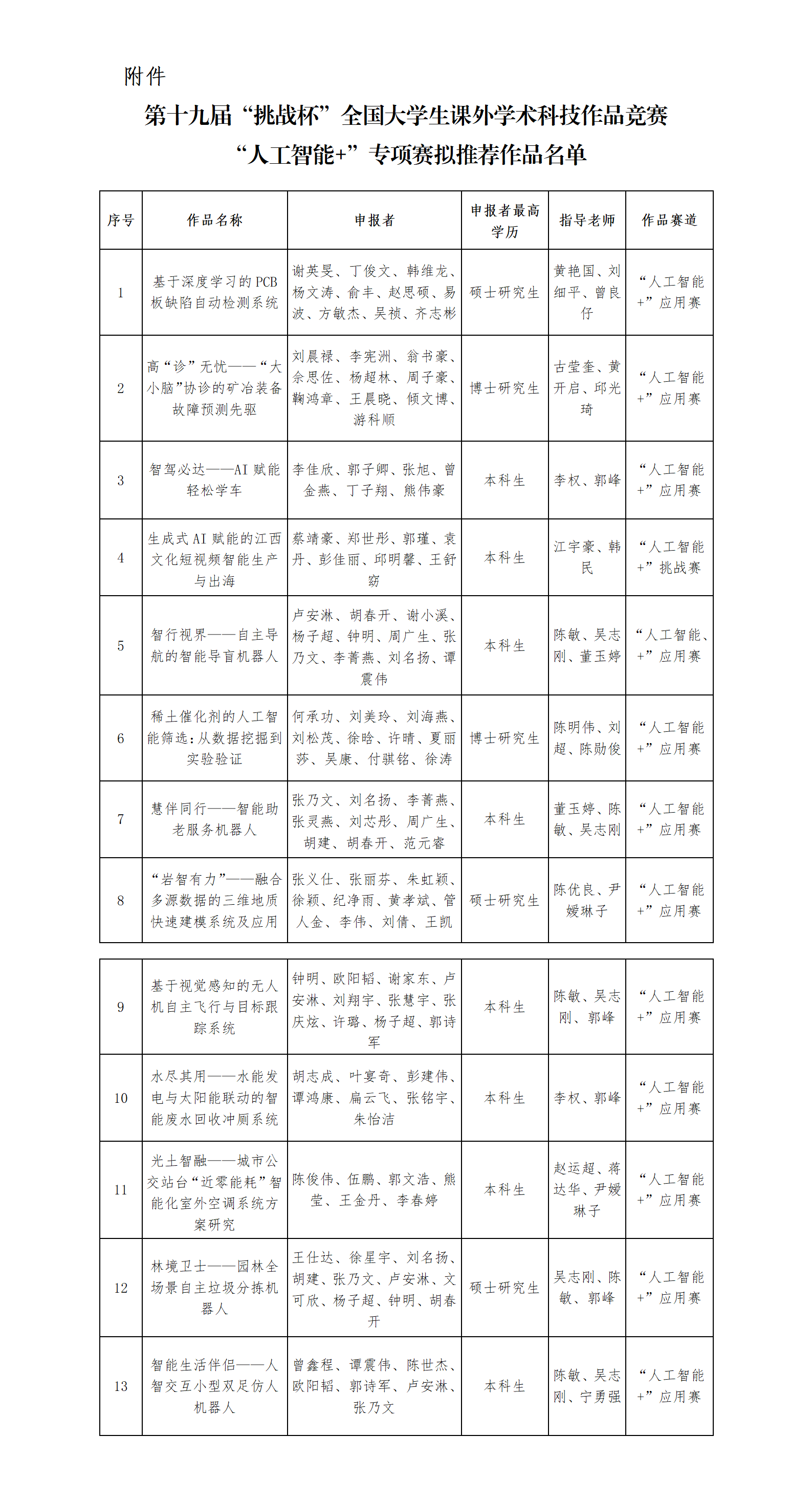 关于第十九届“挑战杯”全国大学生课外学术科技作品竞赛“人工智能+”专项赛拟推荐作品的公示